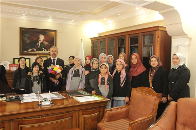 Tokat Mehmet Akif Ersoy Hafızlık Proje İmam Hatip Ortaokulu Kur'an Kursu yöneticisi Züleyha Kaya ve öğrenciler, Camiler ve Din Görevlileri Haftası dolayısıyla Tokat İl Müftüsü Esat Yapıcı’yı makamında ziyaret etti.
