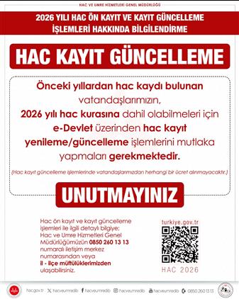2. Bakanlıklararası Hac ve Umre Kurulu kararı gereği, kayıt yenileme işlemleri zorunludur. Bu kapsamda kayıt yenilemeyen vatandaşlarımız, 2026 yılı hac kurasına katılamayacaktır.